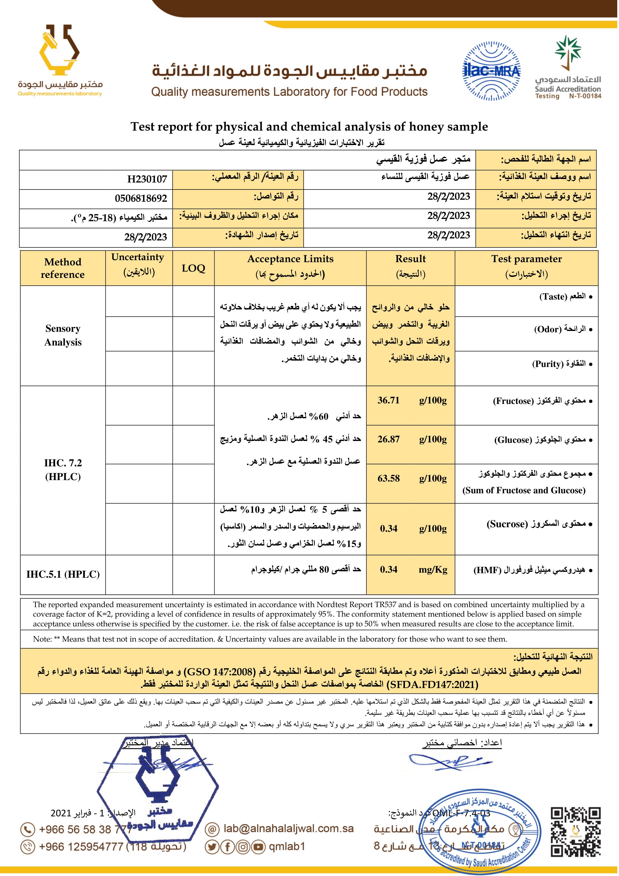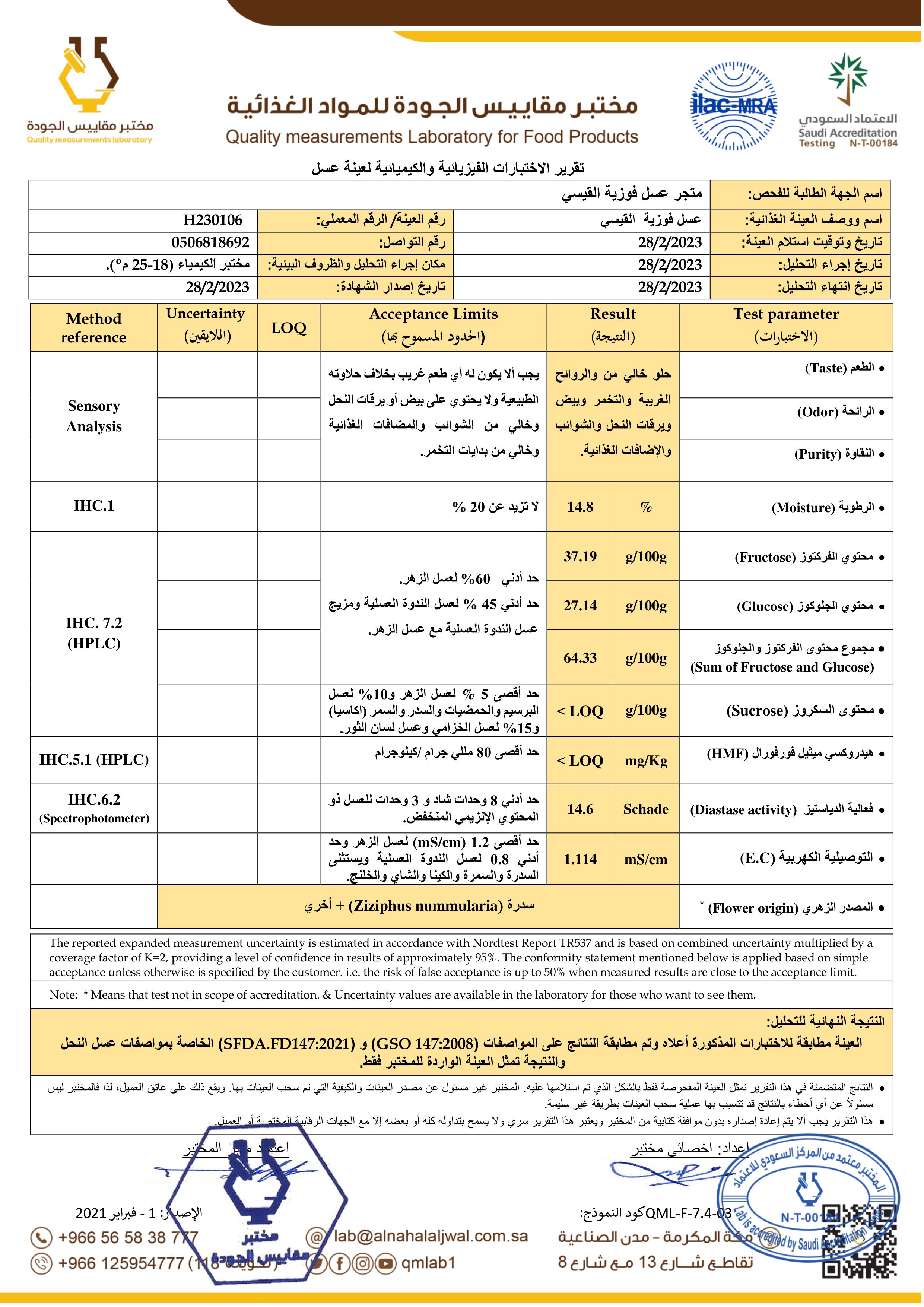 نضمن لكم جودة العسل. العسل مفحوص مخبرياً من مختبر مقاييس الجودة للمواد الغذائية وحاصل على الاعتماد السعودي و مطابق للمواصفات الخليجية و مواصفة الهيئة العامة للغذاء والدواء رقم (SFDA.FD147:2021)